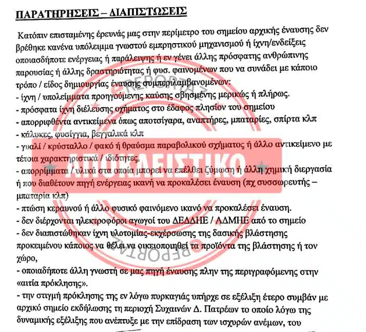 Πιο αναλυτικά, όπως επισημαίνεται στην έκθεση οι αξιωματικοί της ΔΑΕΕ δεν εντόπισαν, «ίχνη / υπολείμματα προηγούμενης καύσης σβησμένης μερικώς ή πλήρως, πρόσφατα ίχνη διέλευσης οχήματος στο έδαφος πλησίον του σημείου, απορριφθέντα αντικείμενα όπως αποτσίγαρα, αναπτήρες, μπαταρίες, σπίρτα κλπ, κάλυκες, φυσίγγια, βεγγαλικά κλπ, γυαλί / κρύσταλλο / φακό ή θραύσμα παραβολικού σχήματος ή άλλο αντικείμενο με τέτοια χαρακτηριστικά / ιδιότητες κτλ».