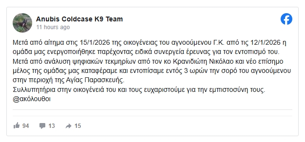 Τραγική εξέλιξη είχε η υπόθεση της εξαφάνισης του 25χρονου Γιώργου Κοτσαύτη, τα ίχνη του οποίου είχαν χαθεί από το Μαρούσι στις 12 Ιανουαρίου 2026.