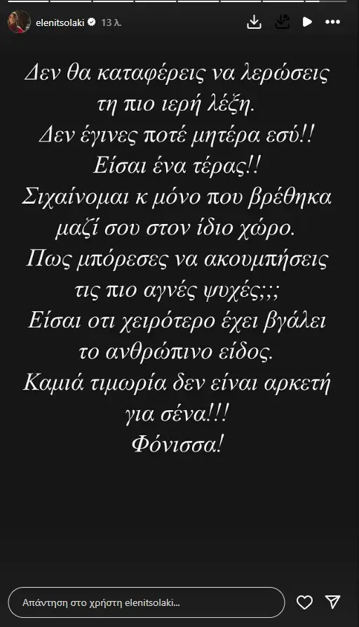 «Δε θα καταφέρεις να λερώσεις την πιο ιερή λέξη. Δεν έγινες ποτέ μητέρα εσύ!! Είσαι ένα τέρας!! Σιχαίνομαι και μόνο που βρέθηκα μαζί σου στον ίδιο χώρο. Πώς μπόρεσες να ακουμπήσεις τις πιο αγνές ψυχές;;; Είσαι ό,τι χειρότερο έχει βγάλει το ανθρώπινο είδος. Καμιά τιμωρία δεν είναι αρκετή για σένα!!! Φόνισσα!» έγραψε στην ανάρτησή της η παρουσιάστρια.