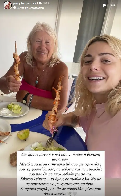 «Δεν ήσουν μόνο η νονά μου. Ήσουν η δεύτερη μαμά μου. Μεγάλωσα μέσα στην αγκαλιά σου, με την αγάπη σου, τη φροντίδα σου, τις γεύσεις και τις μυρωδιές σου που θα με ακολουθούν για πάντα. Σήμερα λείπεις κι όμως σε νιώθω εδώ. Να με προστατεύεις, να με κρατάς όπως πάντα» και πρόσθεσε κλείνοντας: «Σ’ αγαπώ γιαγιά μου, θα σε κουβαλάω μέσα μου όσο αναπνέω».