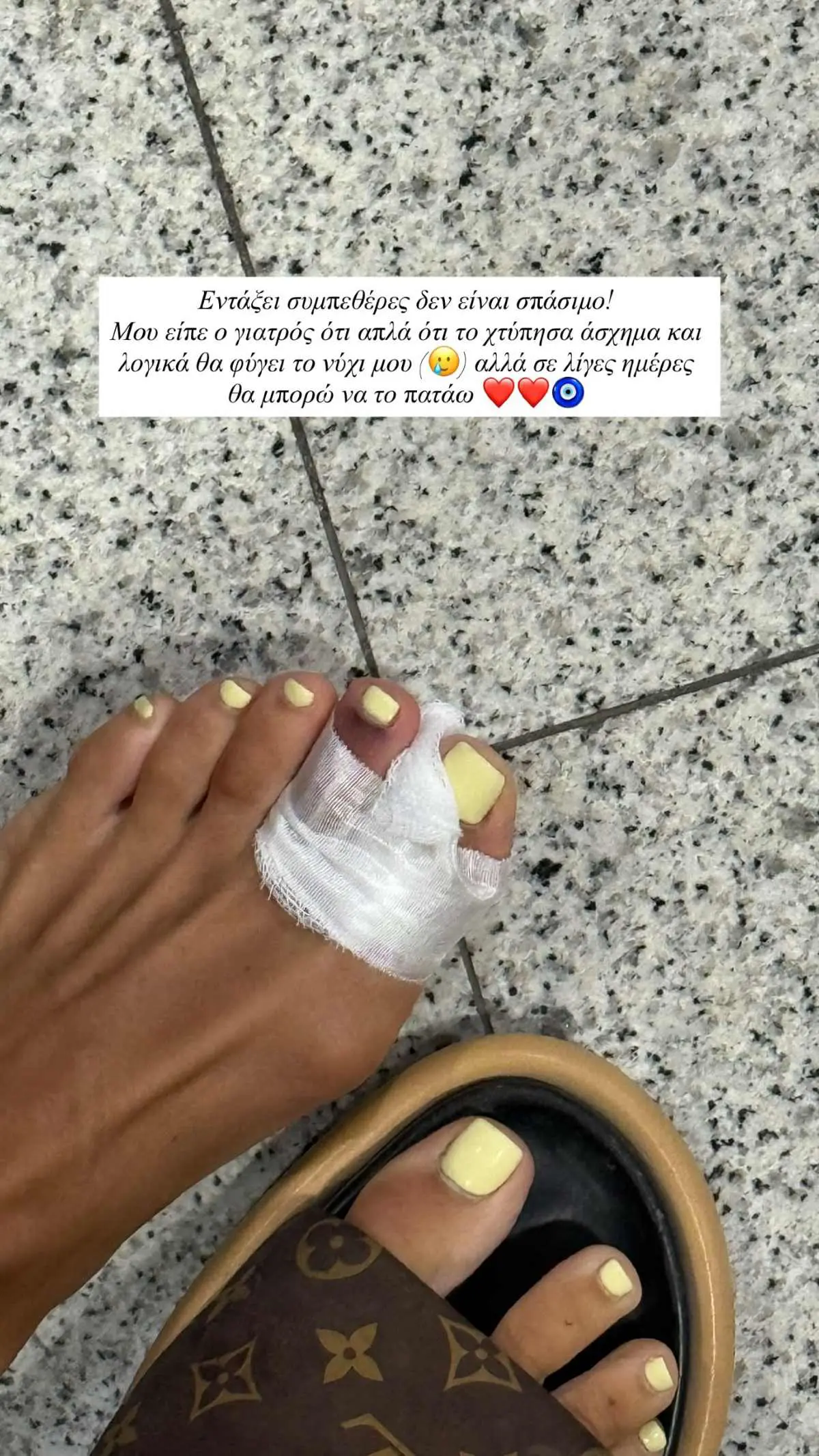 Σε δεύτερη ανάρτησή, ενημερώνει τους followers της ότι δεν πρόκειται για κάτι ανησυχητικό αλλά ούτε και για κατάγμα, και ότι απλώς υπάρχει η πιθανότητα να ξεκολλήσει το νύχι της λόγω της σφοδρής σύγκρουσης του ποδιού της με τα βράχια. Συγκεκριμένα, γράφει χαρακτηριστικά: «Εντάξει συμπεθέρες δεν έχω σπάσιμο! Μου είπε ο γιατρός ότι απλά το χτύπησα άσχημα και λογικά θα φύγει το νύχι μου αλλά σε λίγες ημέρες θα μπορώ να το πατάω».