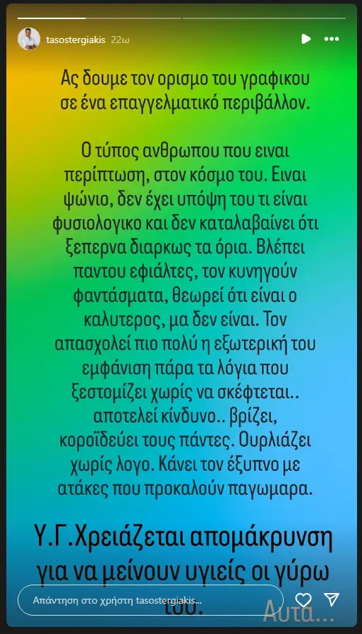 Σε όλα αυτά προστέθηκε μια ανάρτηση – κόλαφος του Τάσου Τεργιάκη στη σελίδα του στο Instagram χωρίς να κατονομάζει ευθέως κάποιο πρόσωπο αλλά ενδεχομένως να «φωτογραφίζει» μια κατάσταση.