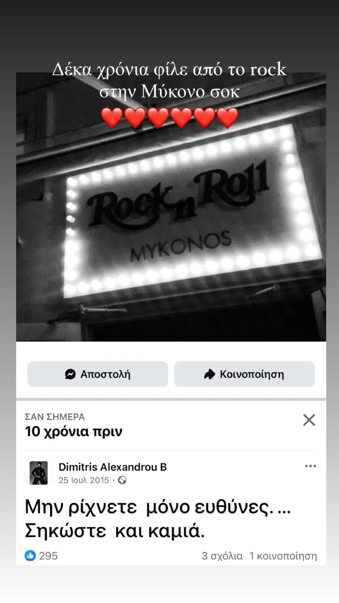 Αν και μέχρι στιγμής ο ίδιος δεν έχει κάνει κάποια επίσημη δήλωση, φαίνεται πως δεν έμεινε άπραγος. Αντί να μπει σε δημόσια αντιπαράθεση, ο Δημήτρης Αλεξάνδρου προτίμησε να απαντήσει με τον δικό του τρόπο: ένα story στον λογαριασμό του στο Instagram, από πριν 10 χρόνια, με φωτογραφία από το Rock n Roll στη Μύκονο.