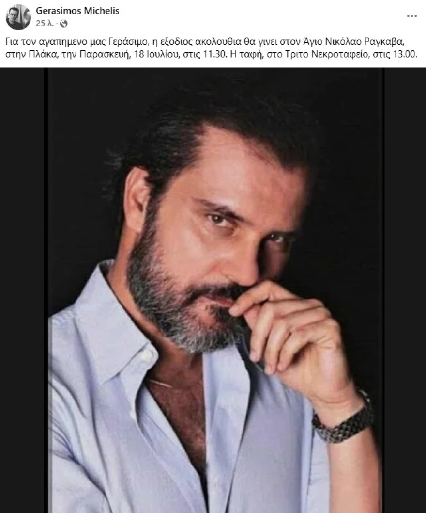 «Για τον αγαπημένο μας Γεράσιμο, η εξόδιος ακολουθία θα γίνει στον Άγιο Νικόλαο Ραγκαβά, στην Πλάκα, την Παρασκευή, 18 Ιουλίου, στις 11.30. Η ταφή, στο Τρίτο Νεκροταφείο, στις 13.00», γράφει η λεζάντα της δημοσίευσης.
