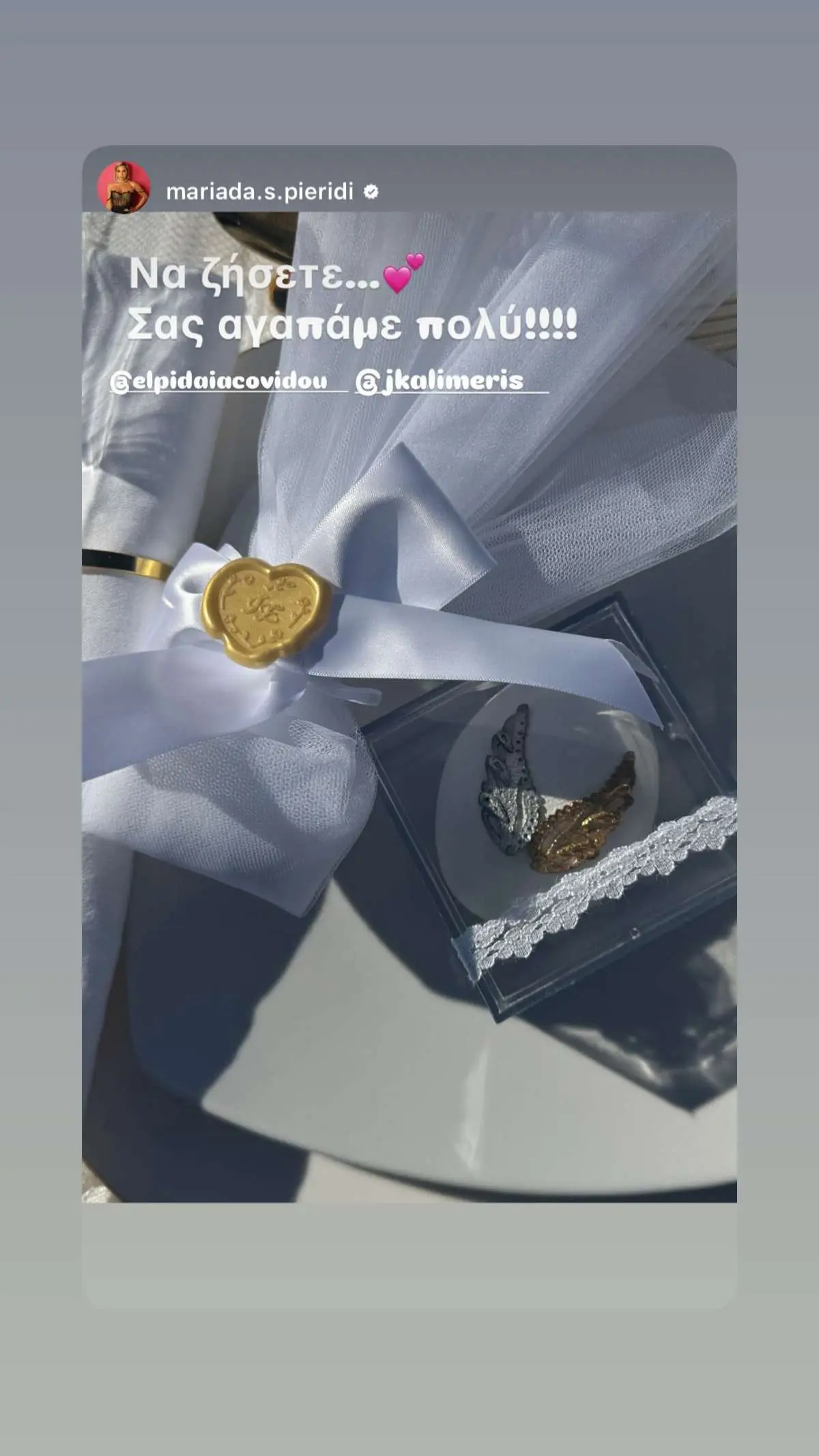 Ανάμεσα στους καλεσμένους ήταν και η Μαριάντα Πιερίδη με τον σύντροφό της, Πάνο Ιωάννου, Η τραγουδίστρια, μετά το μυστήριο, βρέθηκε στον χώρο όπου πραγματοποιείται αυτή τη στιγμή η δεξίωση και ανέβασε μια φωτογραφία από την μπομπονιέρα του ζευγαριού.