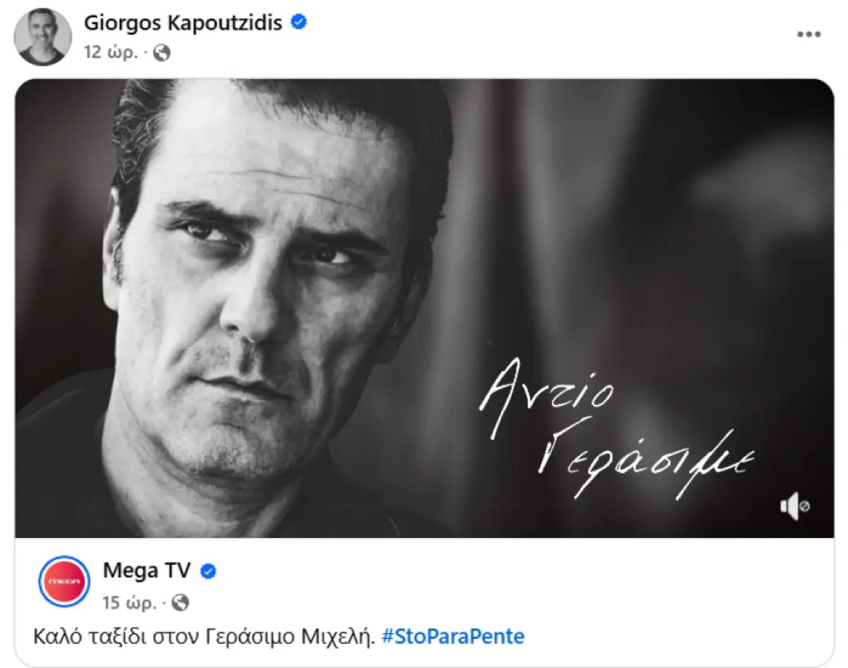 Μια λιτή αλλά βαθιά συγκινητική ανάρτηση έκανε ο Γιώργος Καπουτζίδης στο προσωπικό του προφίλ στα social media, αποχαιρετώντας τον Γεράσιμο Μιχέλη, τον ηθοποιό που αγαπήθηκε ιδιαίτερα μέσα από τη συμμετοχή του στη θρυλική σειρά του Mega, «Στο Παρά Πέντε».