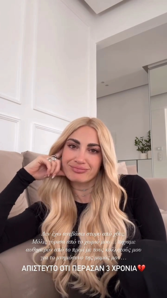 «Είχε μνημόσυνο η μαμά μου για τα τρία χρόνια που έφυγε. Για την ακρίβεια, 19 του μήνα είναι η ακριβής ημερομηνία, αλλά απαγορεύονται τα μνημόσυνα την μεγάλη εβδομάδα. Ήμασταν εκεί και κάπως συγκινήθηκα και παράλληλα χαιρόμουν πολύ που ήταν μαζί μου άνθρωποι που αγαπάω», είπε η Ιωάννα Τούνη.