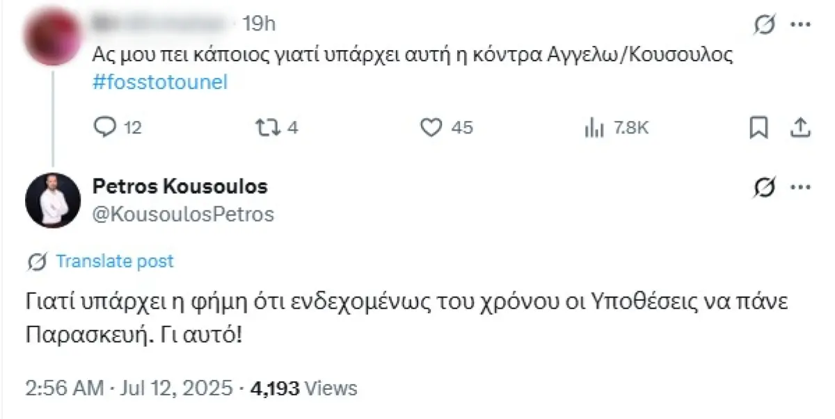 Ένας χρήστης ρώτησε από πού ξεκίνησε αυτή η κόντρα που φαίνεται να υπάρχει ανάμεσα στον ίδιο και την Αγγελική Νικολούλη. Η απάντηση του Πέτρου Κουσουλού ήταν σαφής: «Γιατί υπάρχει η φήμη ότι ενδεχομένως του χρόνου οι Υποθέσεις να πάνε Παρασκευή. Γι’ αυτό!»