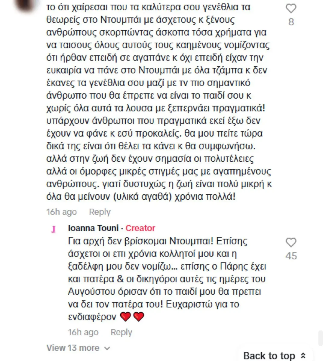 Ανάμεσα στα δεκάδες μηνύματα που δέχτηκε για ευχές, υπήρξε και ένα ιδιαίτερα αιχμηρό σχόλιο που την κατηγόρησε ότι προτίμησε να γιορτάσει πληρώνοντας φίλους για να τη συνοδεύσουν, αντί να περάσει τη μέρα με το παιδί της.