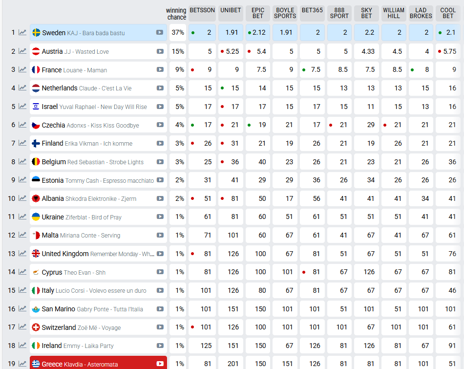 Σύμφωνα με τις πιο πρόσφατες λίστες των στοιχηματικών εταιρειών σε όλη την Ευρώπη, όπως τις παρουσιάζει το eurovisionworld.com, η χώρα μας έχει υποχωρήσει ακόμη περισσότερο, καταλαμβάνοντας πλέον τη 19η θέση στις πιθανότητες νίκης, με ποσοστό μόλις 1%, κάτι που δείχνει ξεκάθαρα ότι η στήριξη προς τη φετινή ελληνική συμμετοχή έχει μειωθεί κι άλλο.