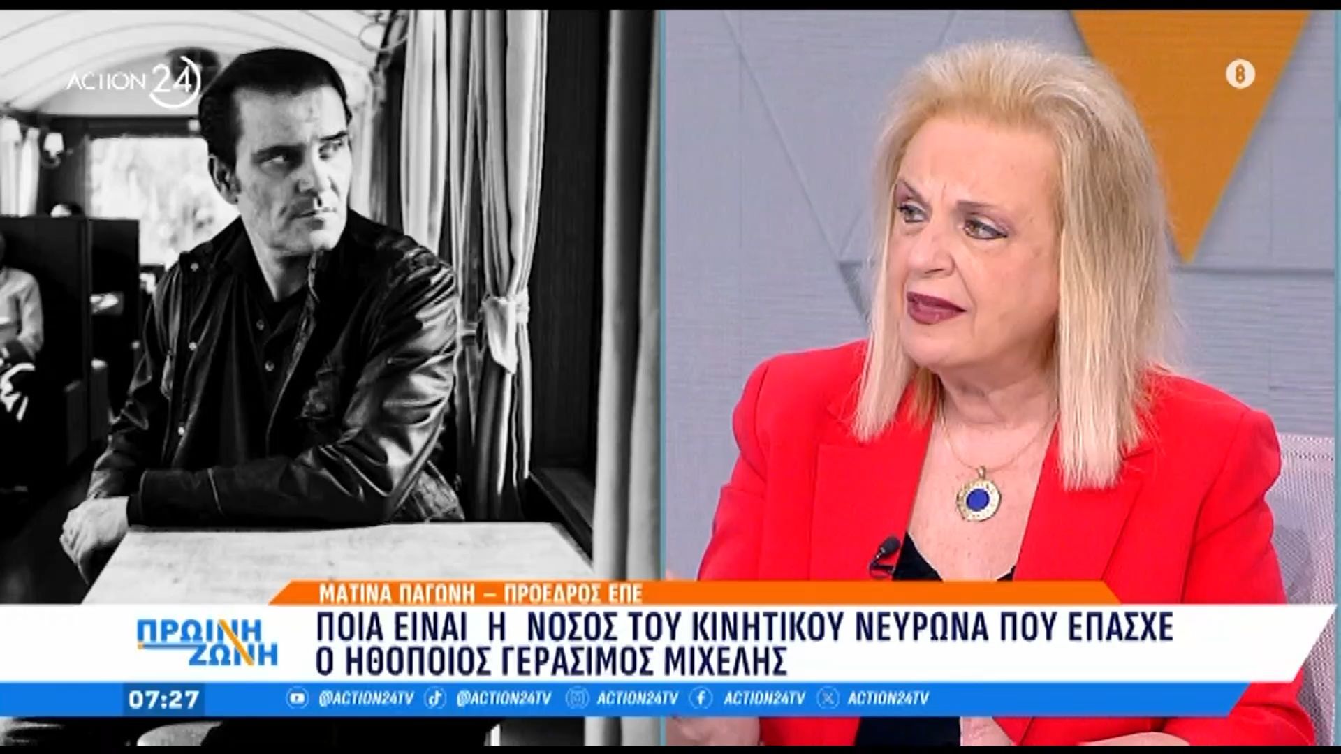 Το πρωί της Τετάρτης 16 Ιουλίου, η Ματίνα Παγώνη βρέθηκε ως καλεσμένη στην εκπομπή του Action 24, Πρωινή ζώνη, και μίλησε για τη νόσο αυτή, τονίζοντας πως δεν υπάρχει ίαση και πως το τελευταίο στάδιο είναι το πιο δύσκολο και για το πρόσωπο που το βιώνει αλλά και για τους οικείους του.
