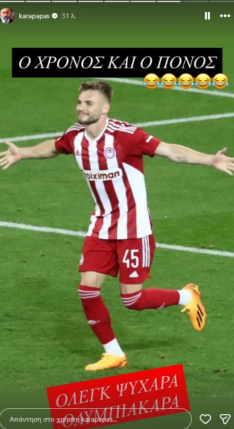 Ο αντιπρόεδρος της ΠΑΕ Ολυμπιακός χαρακτήρισε τον ιδιοκτήτη της ΠΑΕ Παναθηναϊκός αποτυχημένο, ενώ μάλιστα δημοσίευσε και μία φωτογραφία του Όλεκ Ρέαμπτσιουκ, ο οποίος στέρησε από τους «πράσινους» το ελληνικό πρωτάθλημα του 2023.