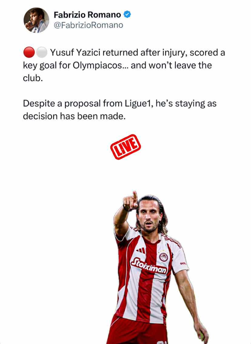 «Ο Γιουσούφ Γιαζίτσι επέστρεψε μετά τον τραυματισμό, σκοράροντας ένα κρίσιμο γκολ για τον Ολυμπιακό και δεν θα φύγει από την ομάδα. Παρά την πρόταση από ομάδα της Ligue 1, θα παραμείνει, η απόφαση έχει παρθεί», επισημαίνει ο Ιταλός ρεπόρτερ μέσω story στο Instagram.