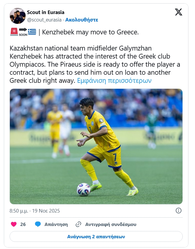 Σύμφωνα με δημοσίευμα του «Scout Eurasia», που ασχολείται με μεταγραφικά θέματα στο Καζακστάν, οι Πειραιώτες βρίσκονται σε προχωρημένες επαφές με τον Κενζέμπεκ.