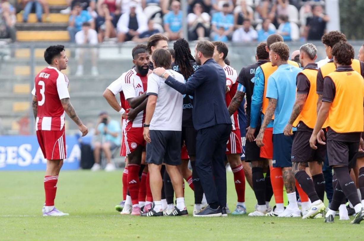 Άναψαν τα αίματα στο πρώτο ημίχρονο του φιλικού αγώνα ανάμεσα στον Ολυμπιακό και τη Νάπολι στην Ιταλία.