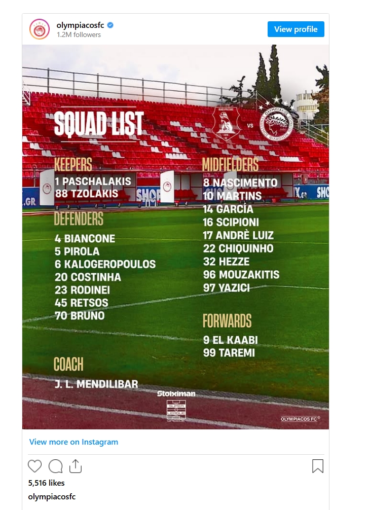 Αναλυτικά η αποστολή του Ολυμπιακού: Πασχαλάκης, Τζολάκης, Μπιανκόν, Πιρόλα, Καλογερόπουλος, Κοστίνια, Ροντινέι, Ρέτσος, Μπρούνο, Νασιμέντο, Ζέλσον, Γκαρθία, Σιπιόνι, Αντρέ Λουίζ, Τσικίνιο, Έσε, Μουζακίτης, Γιαζίτσι, Ταρέμι, Ελ Κααμπί.