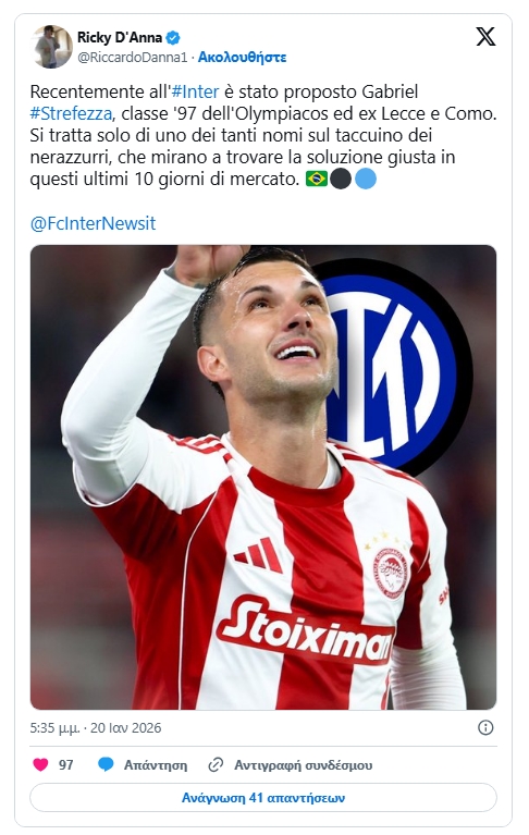 «Ο Γκάμπριελ Στρεφέτσα της Ολυμπιακός, γεννημένος το 1997 και πρώην ποδοσφαιριστής της Λέτσε και της Κόμο, είναι ένα από τα ονόματα που έχουν προταθεί το τελευταίο διάστημα στην Ίντερ. Ο Βραζιλιάνος εξτρέμ συγκαταλέγεται σε μια ευρύτερη λίστα υποψηφίων των «νερατζούρι», οι οποίοι αναζητούν την ιδανική επιλογή ενόψει των τελευταίων δέκα ημερών της μεταγραφικής περιόδου».