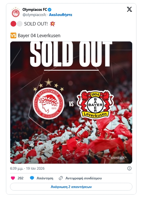 Η ΠΑΕ Ολυμπιακός γνωστοποίησε ότι η κρίσιμη αναμέτρηση με των «ερυθρόλευκων» με τη Λεβερκούζεν έγινε sold out, μία μέρα πριν την έναρξη της!