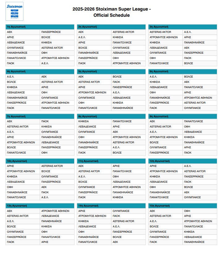 Δείτε το πρόγραμμα της Stoiximan Super League για τη σεζόν 2025/26, όπως προέκυψε από την κλήρωση της Τετάρτης (09/07).