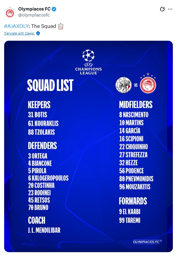 Ο Ολυμπιακός έκανε γνωστή την αποστολή για τον “τελικό” με τον Άγιαξ με στόχο την πρόκριση στα νοκ-άουτ του Champions League.