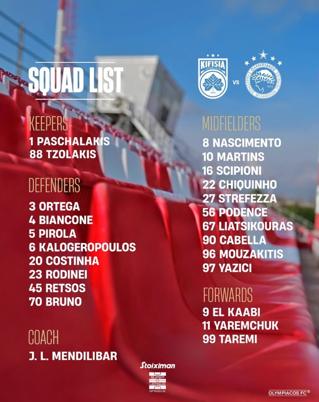 Ο Ολυμπιακός ανακοίνωσε την αποστολή του για το ματς με την Κηφισιά (09/11, 15:00) στη Νίκαια για τη 10η αγωνιστική της Stoiximan Super League. Εκτός έμειναν Ντάνι Γκαρθία και Σαντιάγο Έσε.