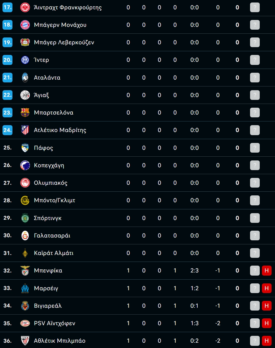 Η βαθμολογία της League Phase του Champions League έπειτα από τα παιχνίδια της Τρίτης