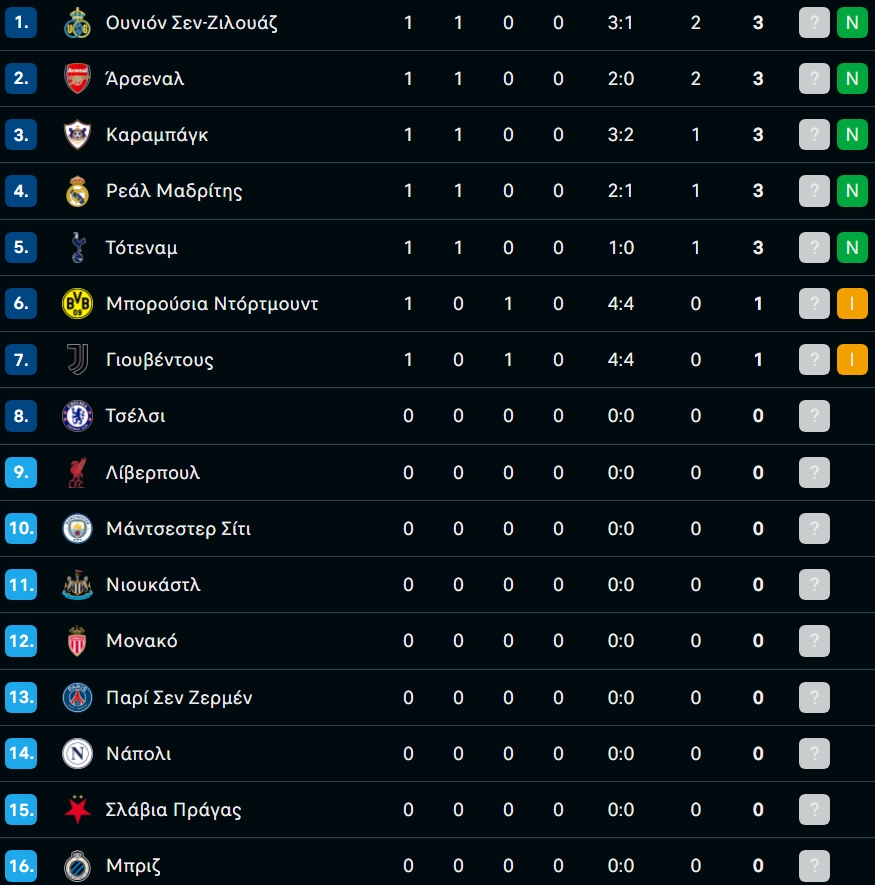 Διαβάστε πως διαμορφώθηκε η βαθμολογία της League Phase του Champions League έπειτα από τους αγώνες της Τρίτης (16/09) για την 1η αγωνιστική.