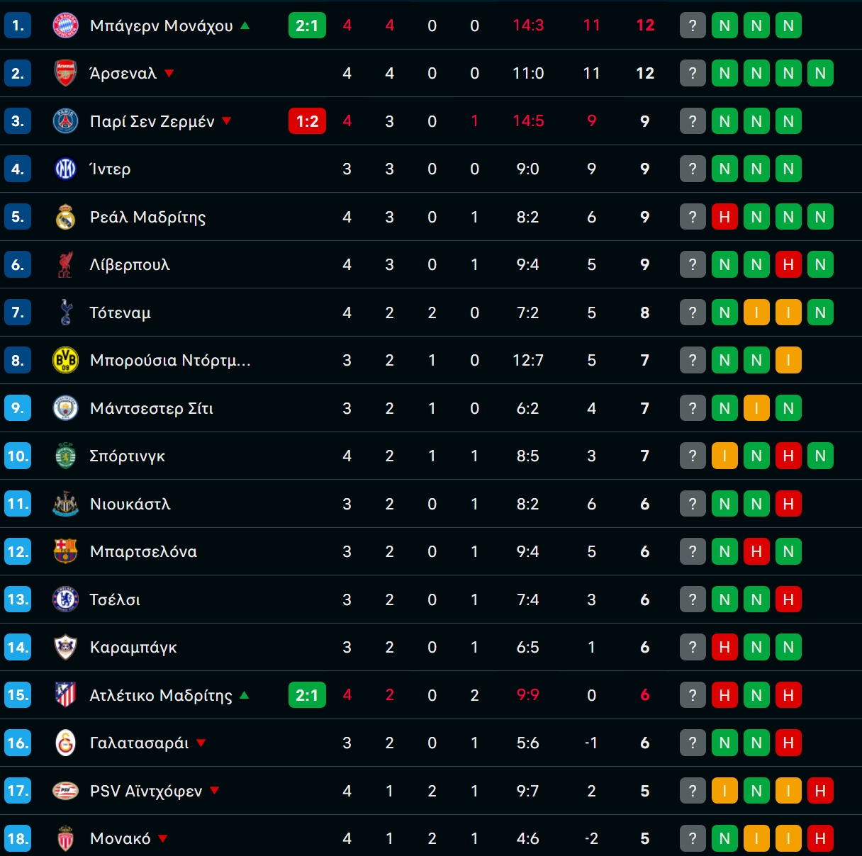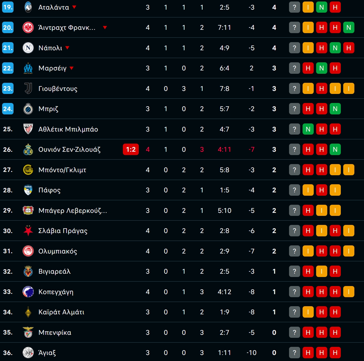 Δείτε πώς έχει διαμορφωθεί η βαθμολογία στη League Phase του Champions League μετά την ισοπαλία του Ολυμπιακού με την Αϊντχόφεν (1-1) στο πλαίσιο της 4ης αγωνιστικής.