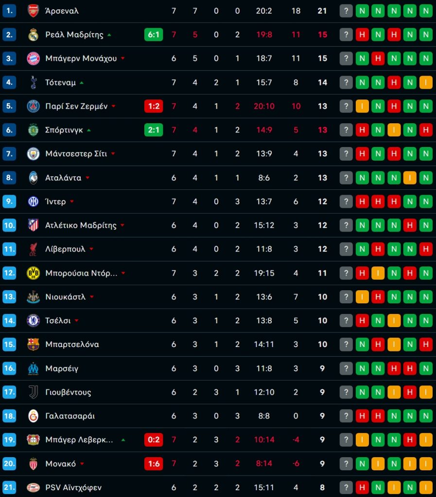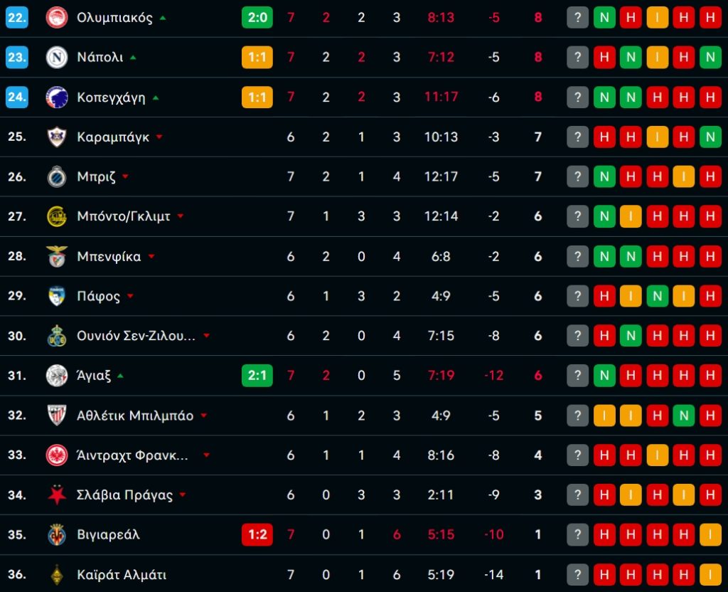 Η βαθμολογία της League Phase του Champions League μετά την νίκη του Ολυμπιακού επί της Λεβερκούζεν!