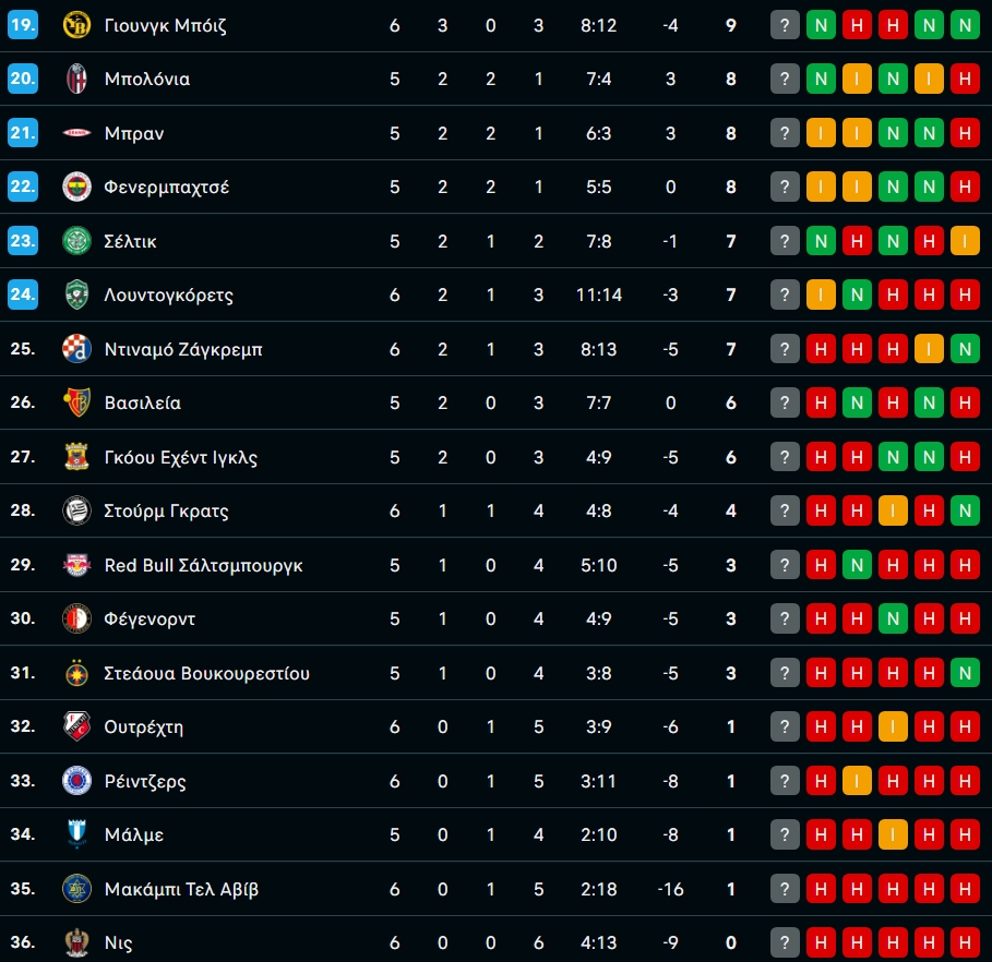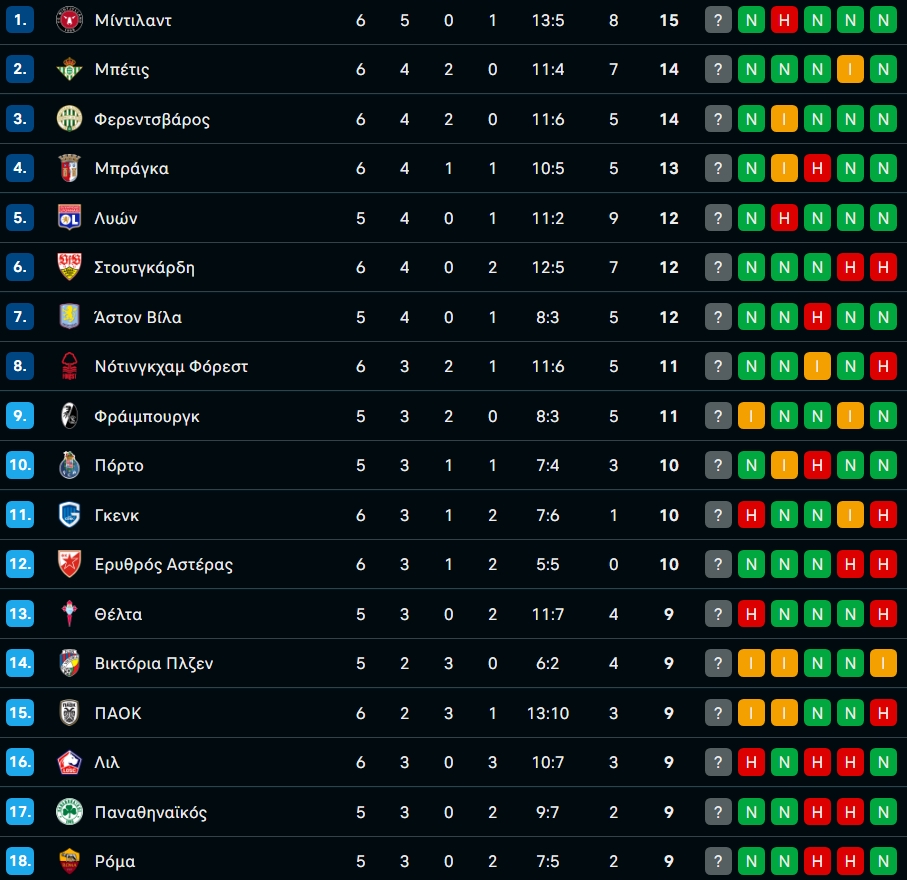 Η βαθμολογία της League Phase του Europa League μετά την ισοπαλία του ΠΑΟΚ με Λουντογκόρετς!