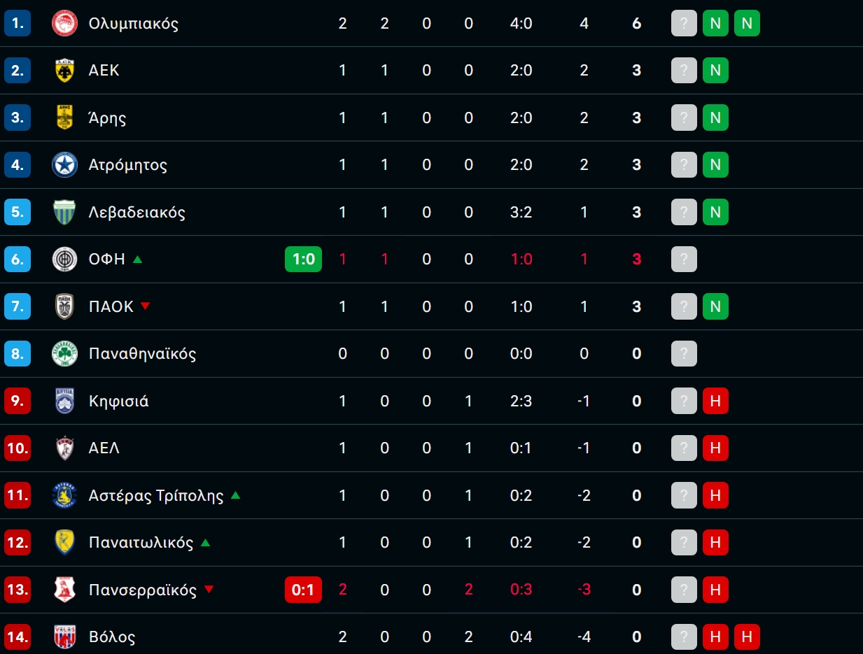 Δείτε πώς έχει διαμορφωθεί η βαθμολογία της Stoiximan Super League μετά τη νίκη του Ολυμπιακού στο Πανθεσσαλικό Στάδιο επί του Βόλου για την 2η αγωνιστική.