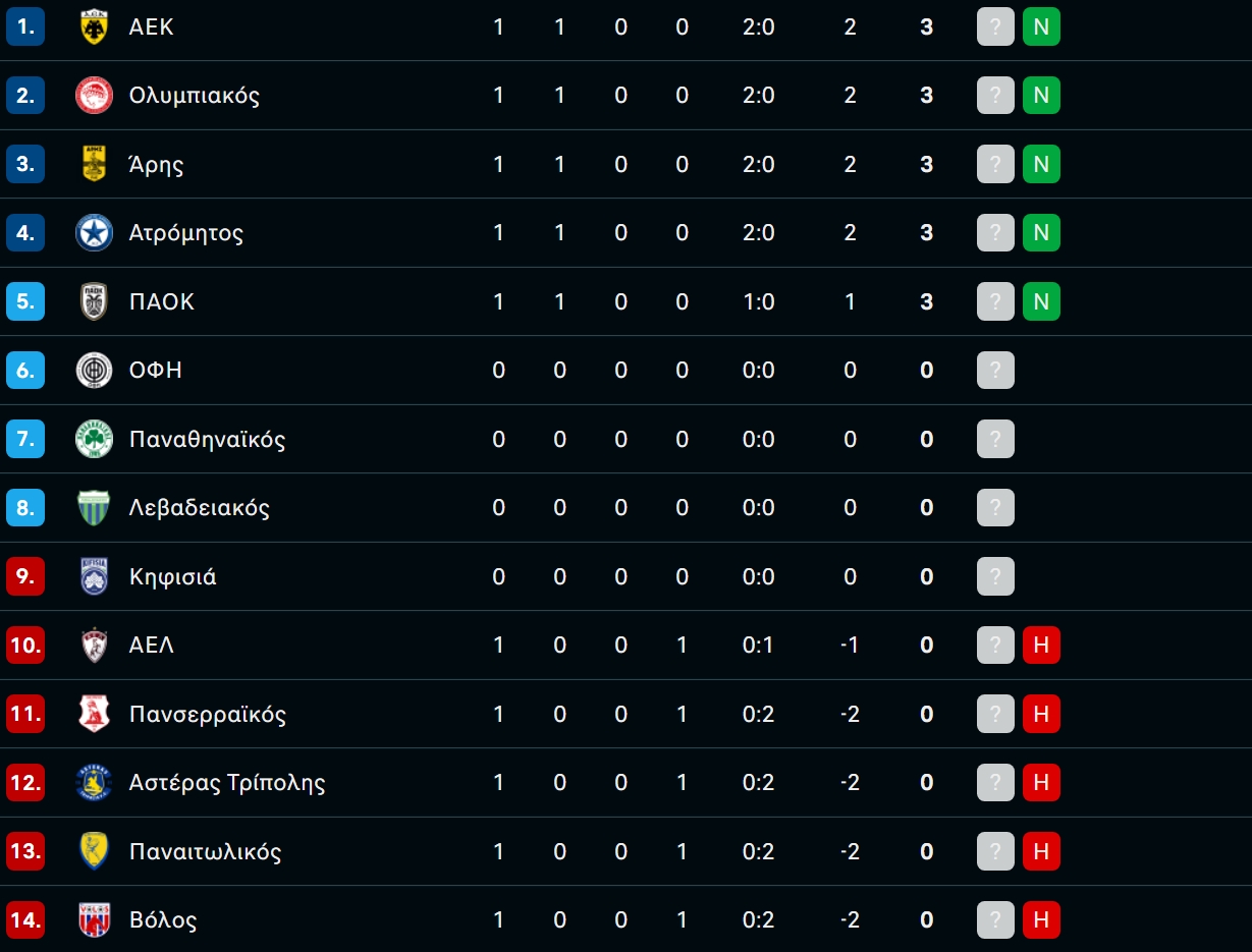 Δείτε τη βαθμολογία της Stoiximan Super League μετά την ολοκλήρωση των πρώτων πέντε ματς της πρεμιέρας: