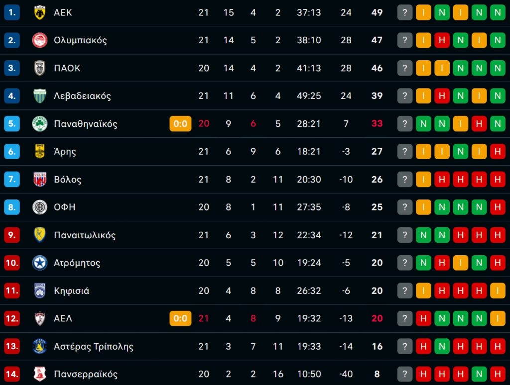 Η βαθμολογία της Stoiximan Super League μετά την ισοπαλία στο ΠΑΟΚ-ΑΕΚ!