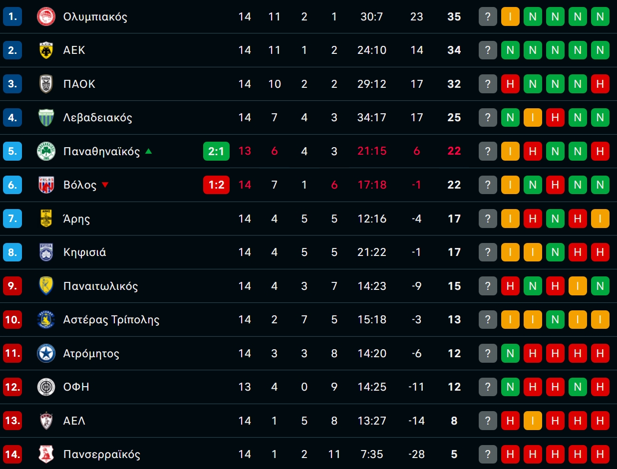 Η βαθμολογία της Stoiximan Super League μετά την ισοπαλία του Ολυμπιακού με Άρη
