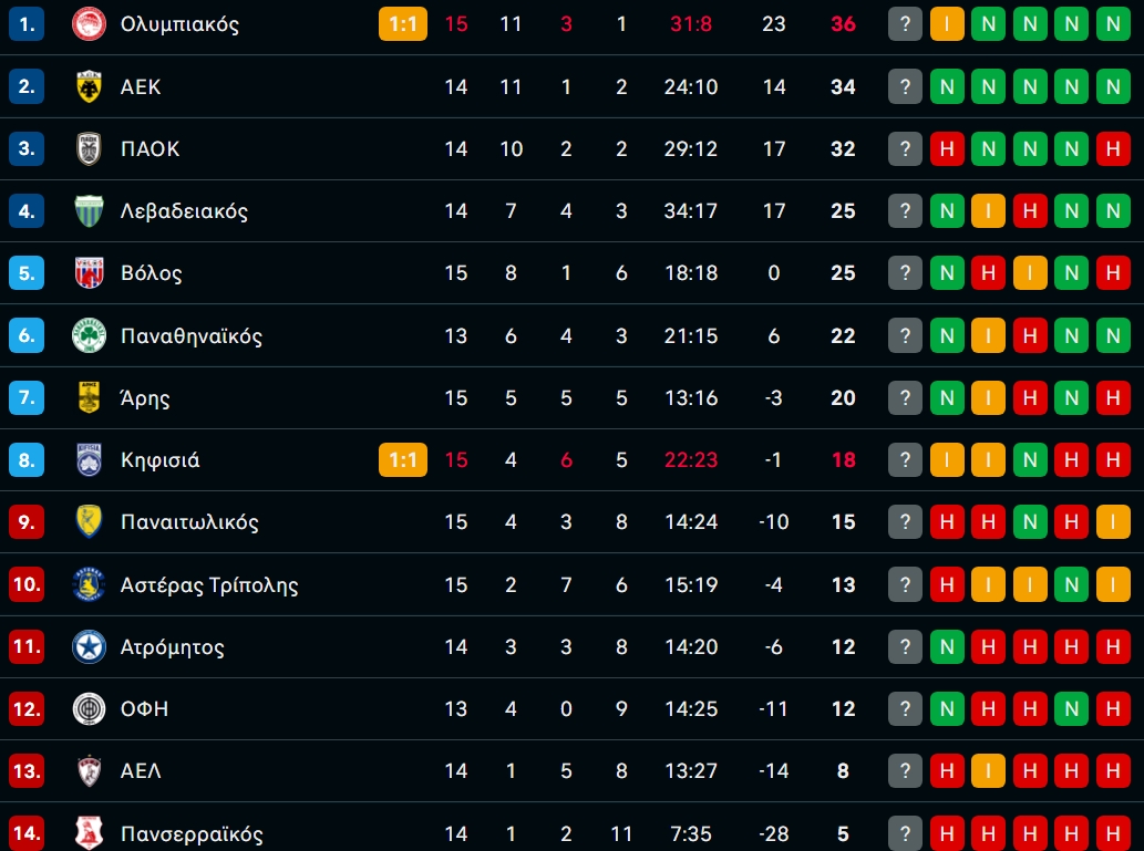 Η βαθμολογία της Stoiximan Super League μετά την ισοπαλία του Ολυμπιακού με Κηφισιά με 1-1