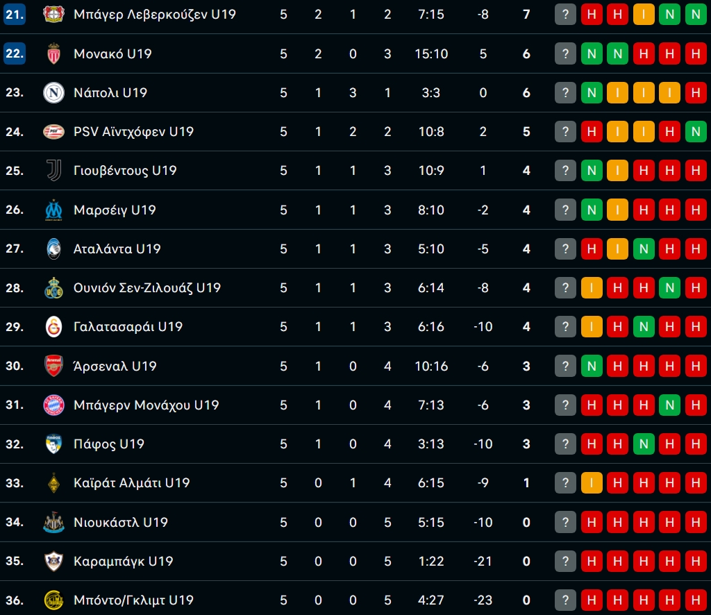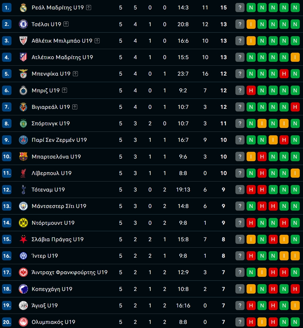 Δείτε πώς διαμορφώθηκε η βαθμολογία της League Phase του Youth League μετά την ήττα της Κ19 του Ολυμπιακού από την Ρεάλ για την 5η αγωνιστική.