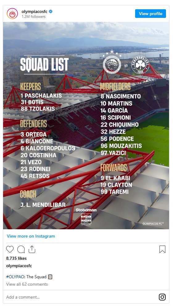 H αποστολή του Ολυμπιακού για το ντέρμπι με τον Παναθηναϊκό στο «Γεώργιος Καραϊσκάκης» (8/2, 21:00). Επιστρέψει ο Ελ Καμπί, εκτός Πιρόλα, Μπρούνο και Λουίζ.