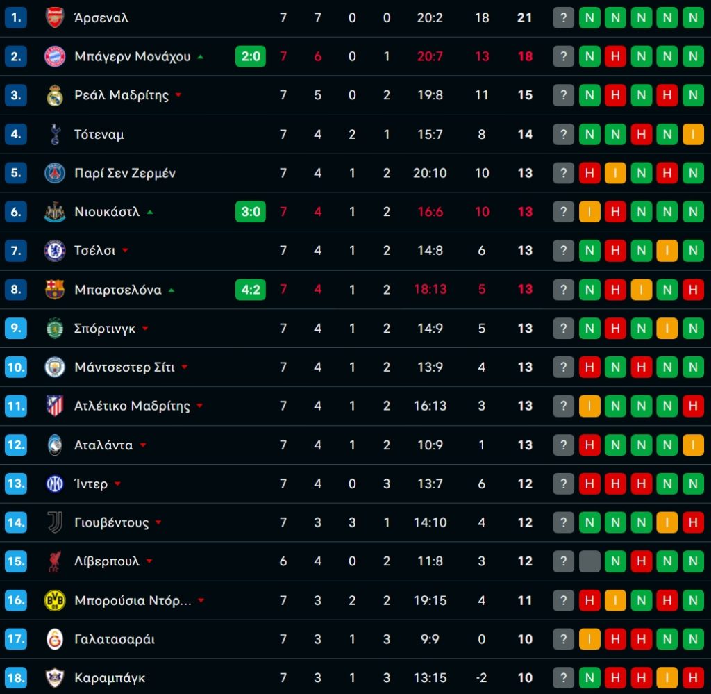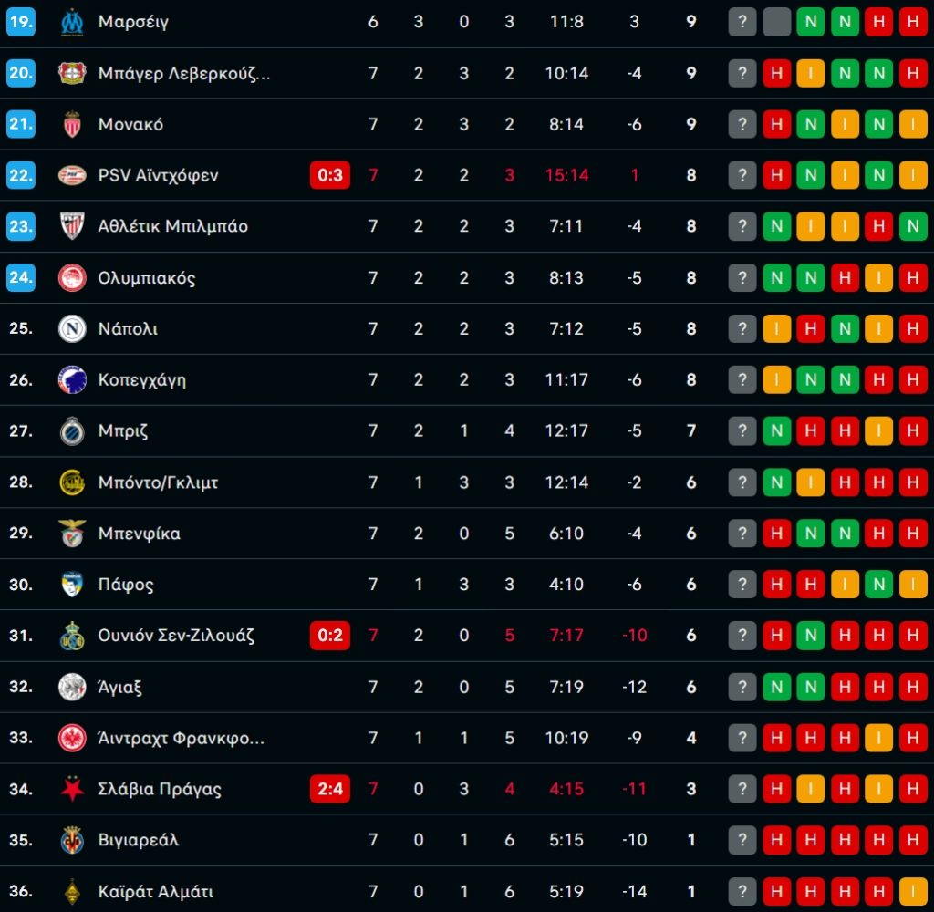 Ο Ολυμπιακός μετά το τέλος της 7ης αγωνιστικής της League Phase του Champions League βρίσκεται στην 24η θέση της βαθμολογίας με οκτώ πόντους.