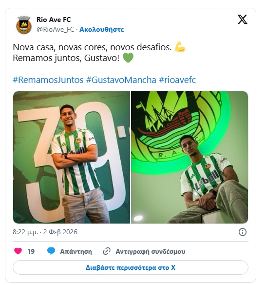 Η Ρίο Άβε καλωσορίζει τον Γκουστάβο Μάνσα και του εύχεται κάθε επιτυχία με τη φανέλα του συλλόγου.