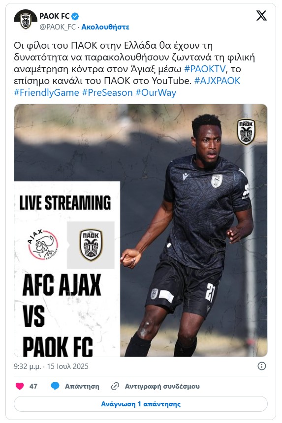 Σε ποιο κανάλι «κλείδωσε» η μετάδοση του ΠΑΟΚ-Άγιαξ