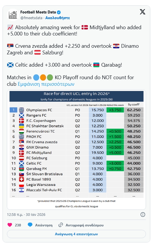 Στα playoffs οι ομάδες δεν παίρνουν βαθμούς από τα αποτελέσματά τους, όμως μπορούν να πάρουν το μπόνους πρόκρισης στους 16 της διοργάνωσης. Αυτό δεν κατάφερε να το πάρει ο Ολυμπιακός. Η κούρσα για το απευθείας εισιτήριο στη League Phase του Champions League έχει διαμορφωθεί ως εξής: